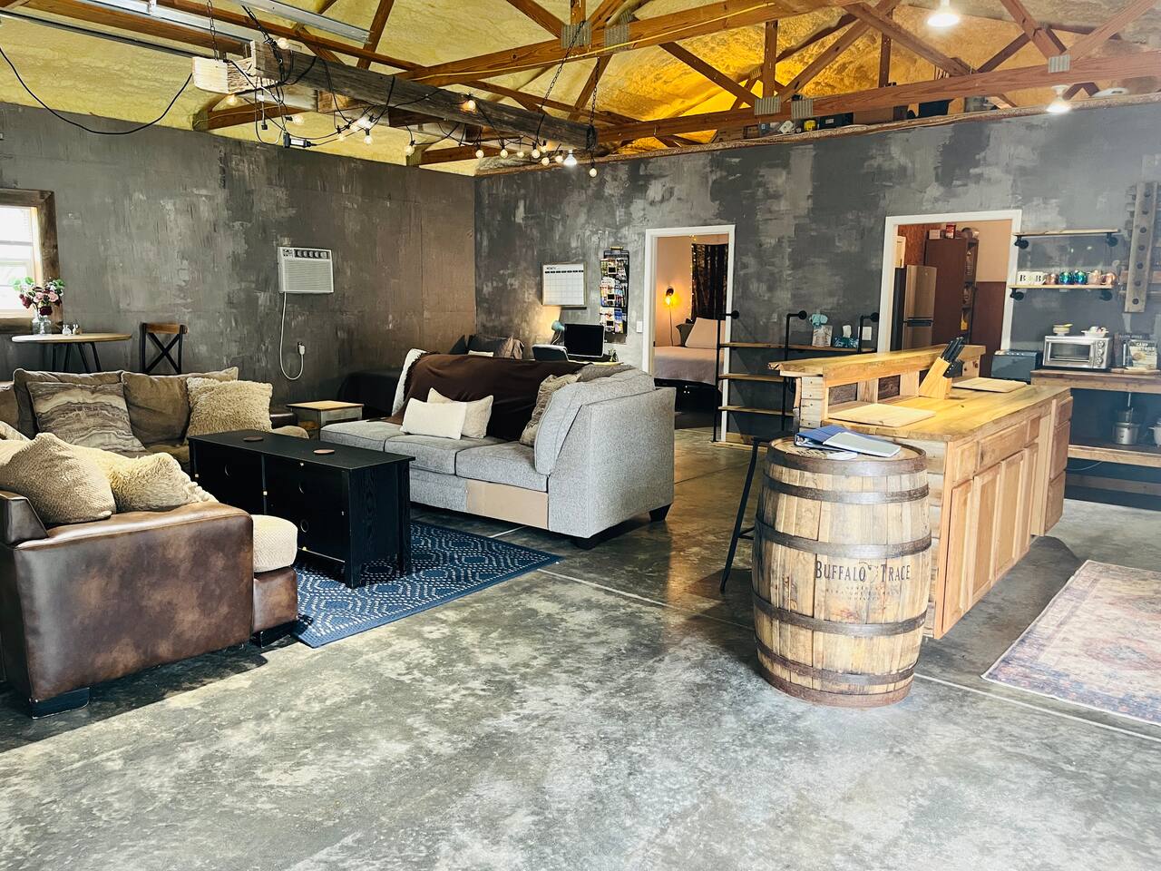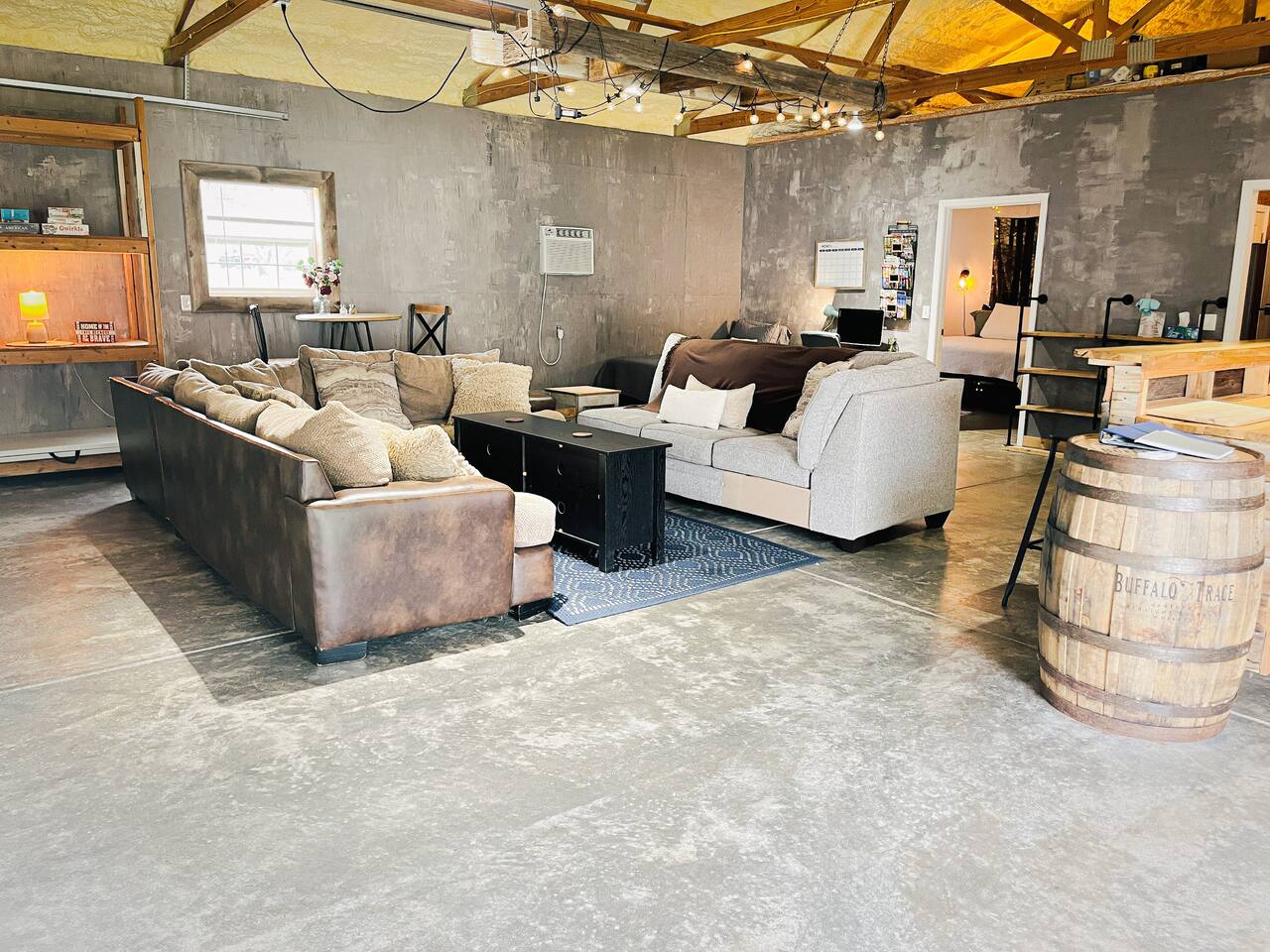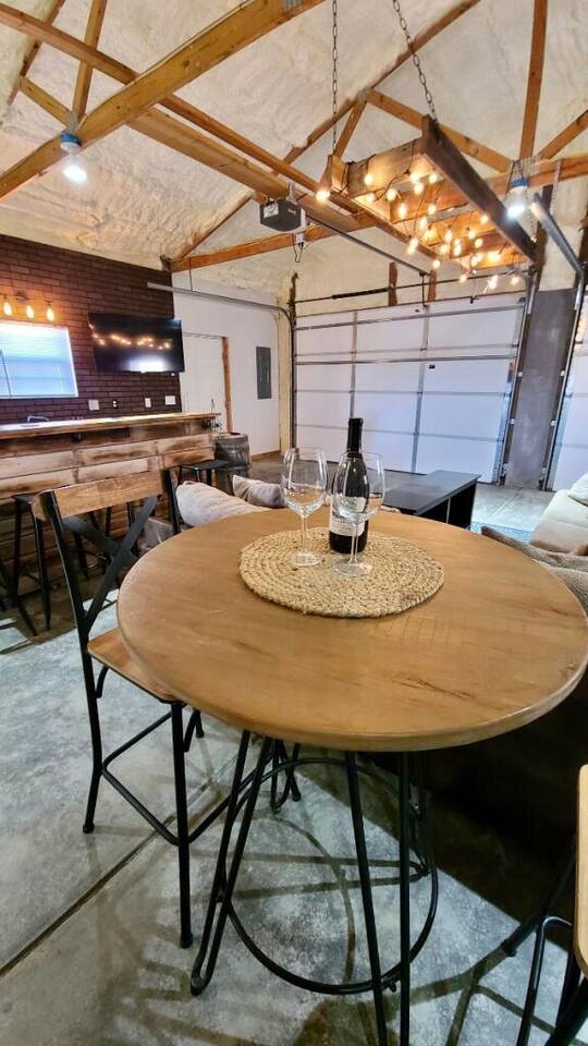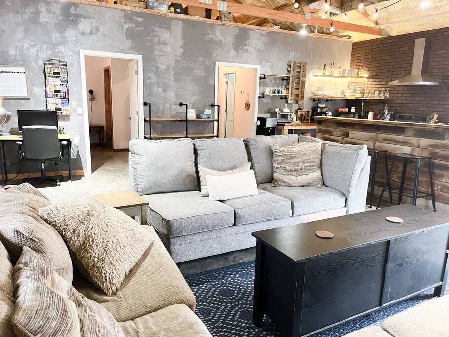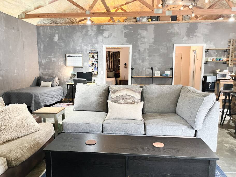 This classy and cozy space will set your imagination free. The unique mix of modern and rustic blend beautifully in this fully equipped Barndominium. The private backyard offers incredible views and the sunsets are not to be missed. Cook in the well stocked kitchen. Get cozy to watch a movie on the smart TV. The King bedroom is spacious and provides an amazing nights sleep with a guest favorite mattress! There is a twin bed and couches in the main living room for more than 2 guests.