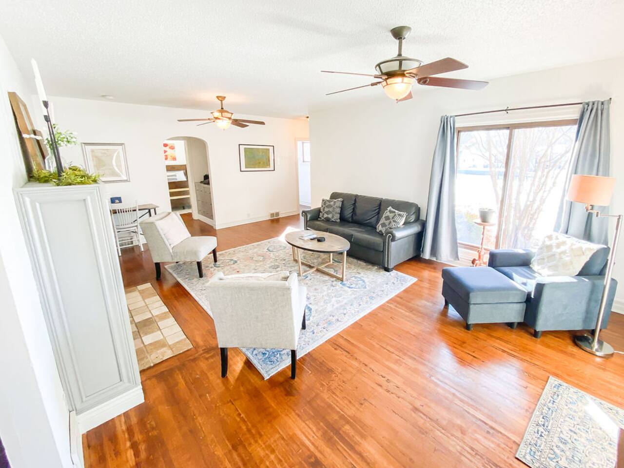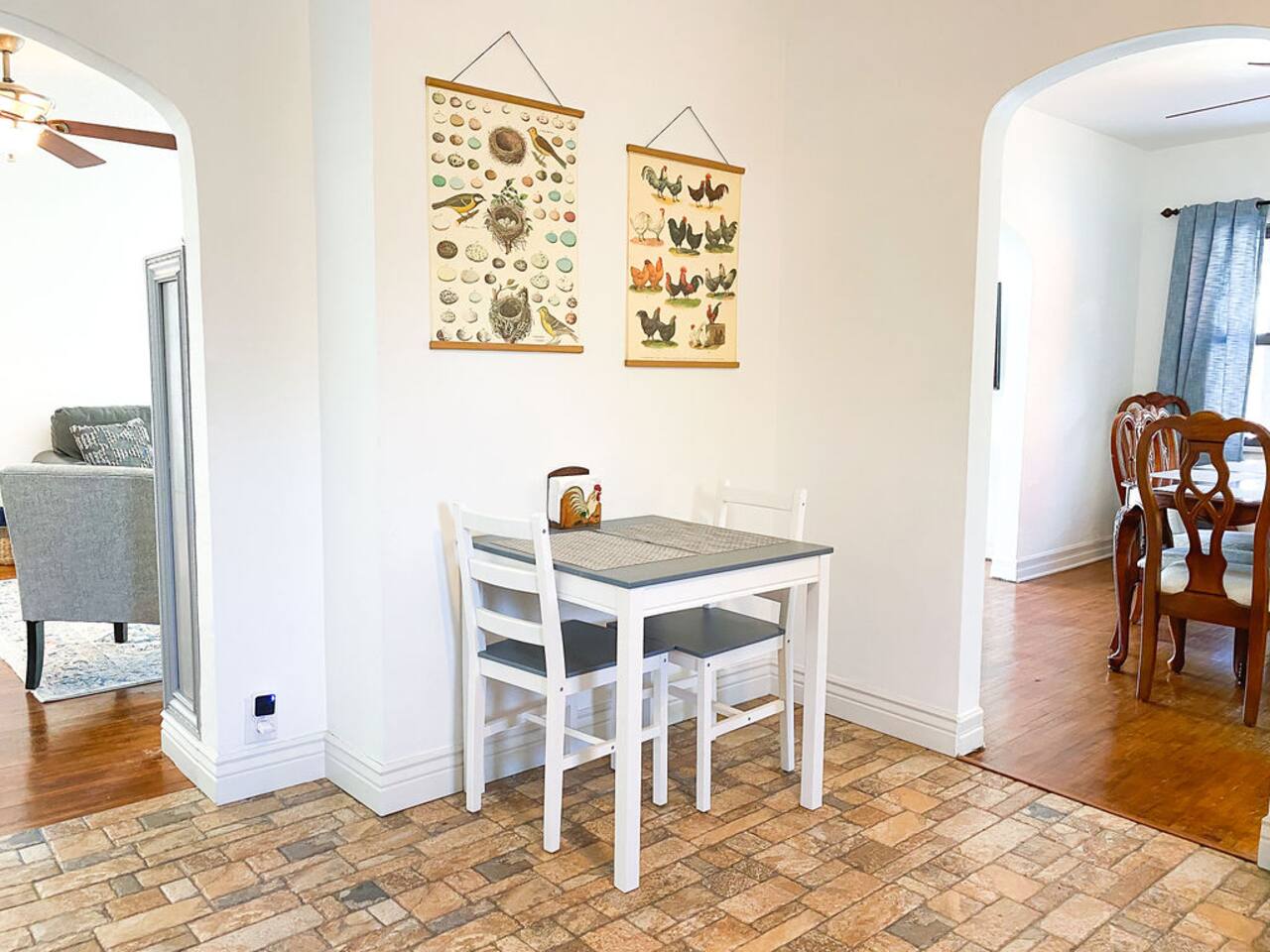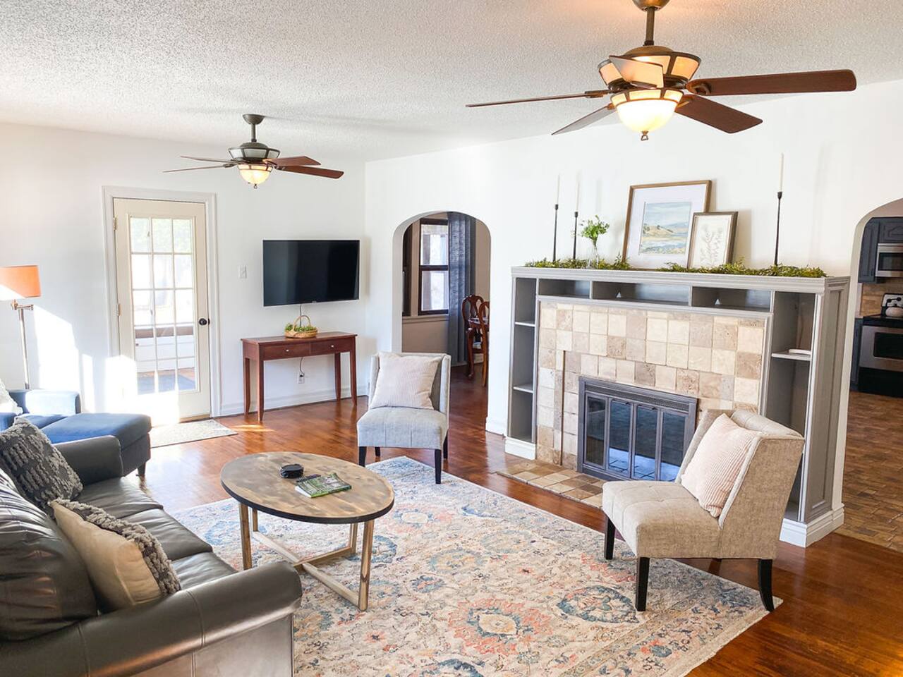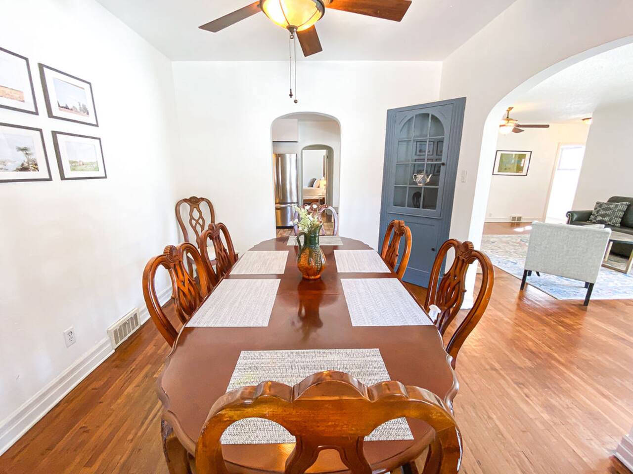 We recently upgraded to a King bed in the primary bedroom! Gather with friends and family in the fully fenced backyard (6ft privacy fence) to grill up a tasty meal on the gas grill or roast marshmallows around the fire pit. Take on a game of Fosball at the full size table, or break out one of the board games for an evening in. The highspeed wireless internet will allow you to surf the web or pull up your favorite shows and movies on the smart TV. Brew yourself up a hot cup of coffee with the Keurig or standard drip pot. Unwind in the walk-in shower or soak in the tub amidst one of the tastefully remodeled bathrooms. The sun room, wood floors and arched doorways will transport you back in time during your stay at this quaint home, while the comfortable mattresses and linens will give you the night’s rest you desire. There is a formal dining room with seats for 8 and a small breakfast nook in the kitchen. Enjoy the Gastro Pub, world-class BBQ or Japanese Stake house, and much more all within 5 minutes. This home is centrally located, allowing you to access everything Springfield has to offer within just minutes.