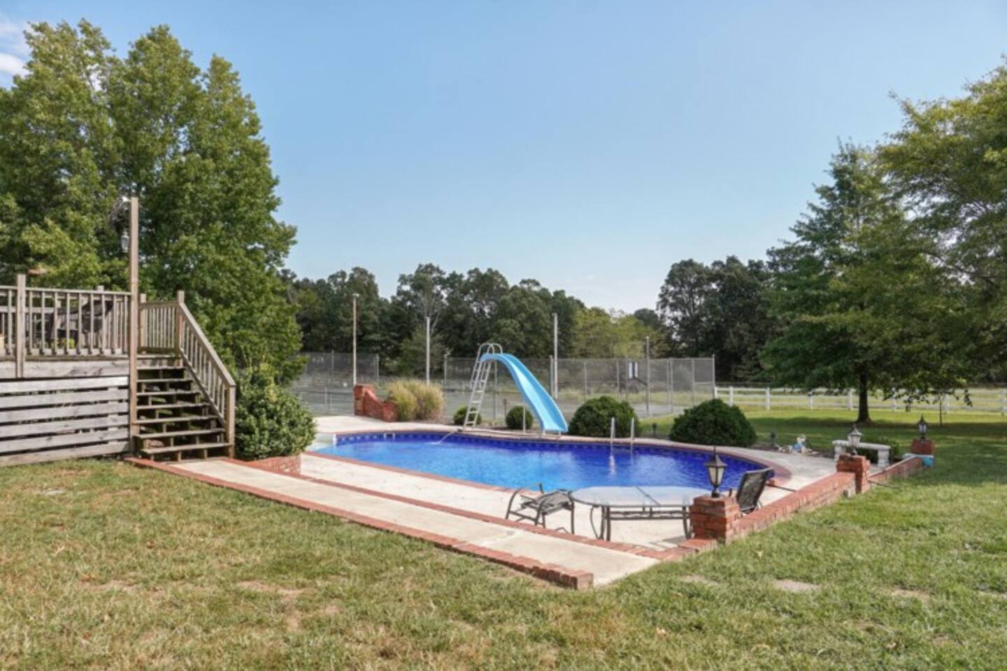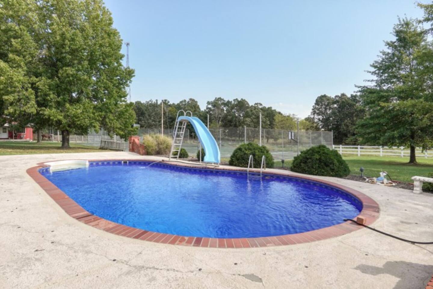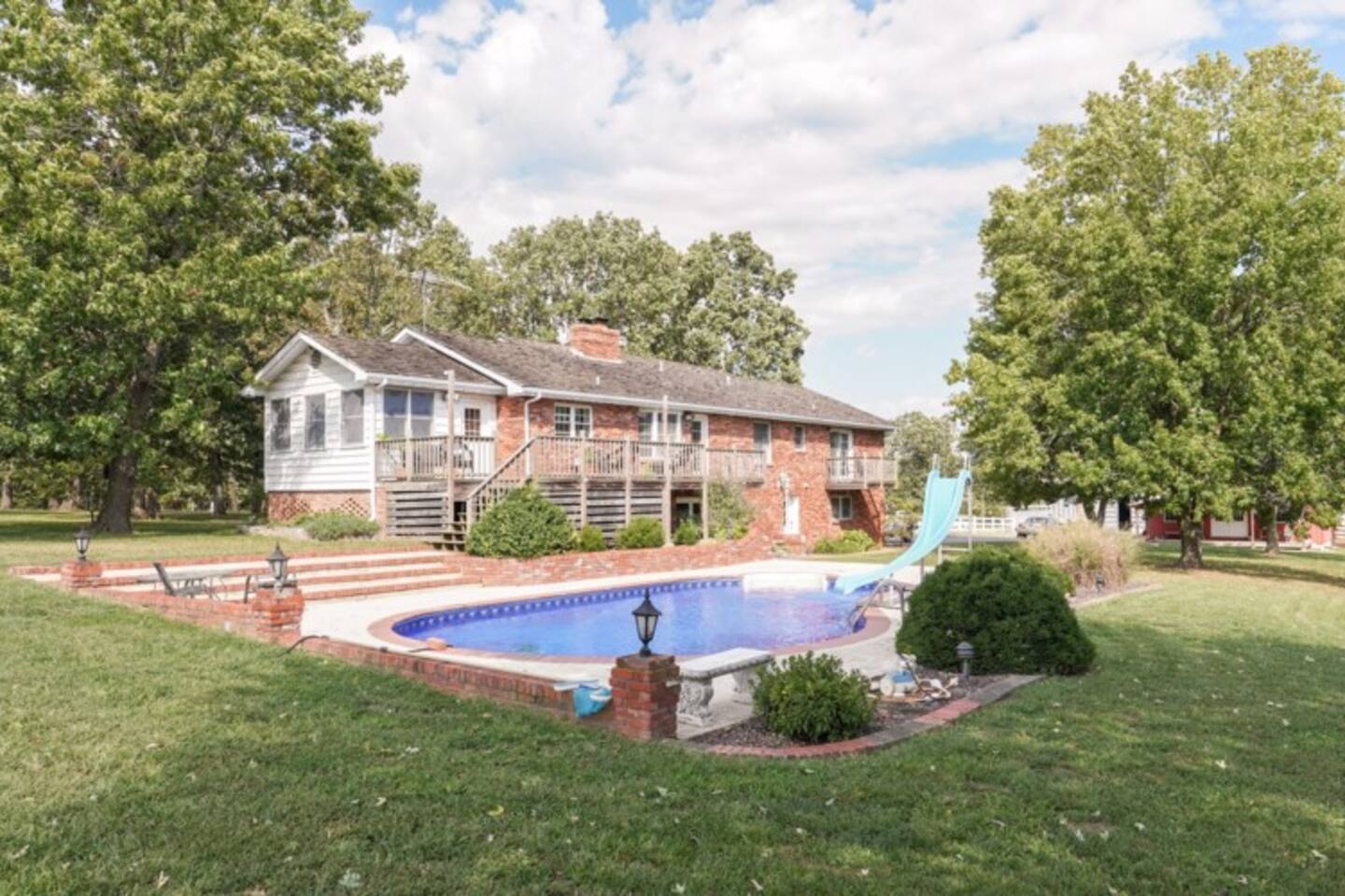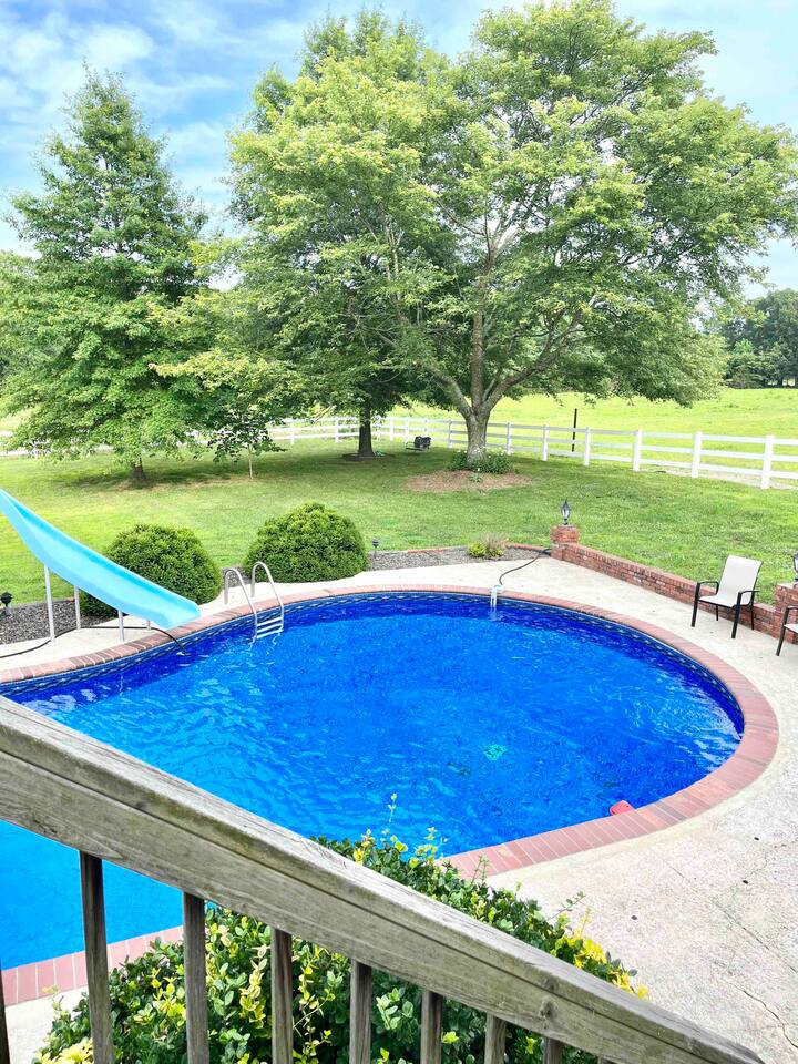 Soak up the fall colors on the patio, grill out on the deck, or play a friendly game of basketball or tennis on the full tennis court. This lovely 3,277 sqft, split level home offers 3 living areas, a spacious kitchen, working fireplace, a cozy sun room, back deck and so much more. Enjoy a family meal around the classic dining table situated in the farmhouse style dining room or pass round sandwiches at the eat bar in the kitchen. Step out back to join your friends and family gathered around the fire-pit, as the steaks and burgers cook on the grill. You may want to curl up for a movie in on a rainy day or setup one of the various board games for a little friendly competition. Enter in the grand front door and up a short flight of stairs to the main living area with smart TV and comfortable seating. The well stocked kitchen awaits overlooking the pool for you to mingle while you prepare your favorite dishes. You can feast together in the large dining room with space for everyone. or sip coffee in the sunroom overlooking the beautiful grounds. This floor holds the Primary bedroom with En Suite bathroom, the second Queen bedroom, Shared Bedroom with Full and Twin bunk beds, and a beautiful shared bathroom with decadent clawfoot tub. Head downstairs to the laundry room, second full living room with smart TV and pull out sofa bed. This level has its own full bathroom and the 4th bedroom with a Queen bed. Exit to ground level with the back yard with beautiful seating areas and the seasonal pool, open May thru September. (ask about specific dates). The Pool is available seasonally. It reopens sometime around Memorial Day 2026 (as for specific date).