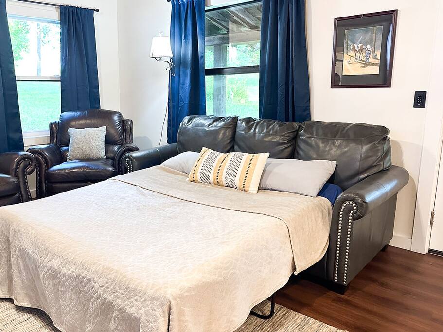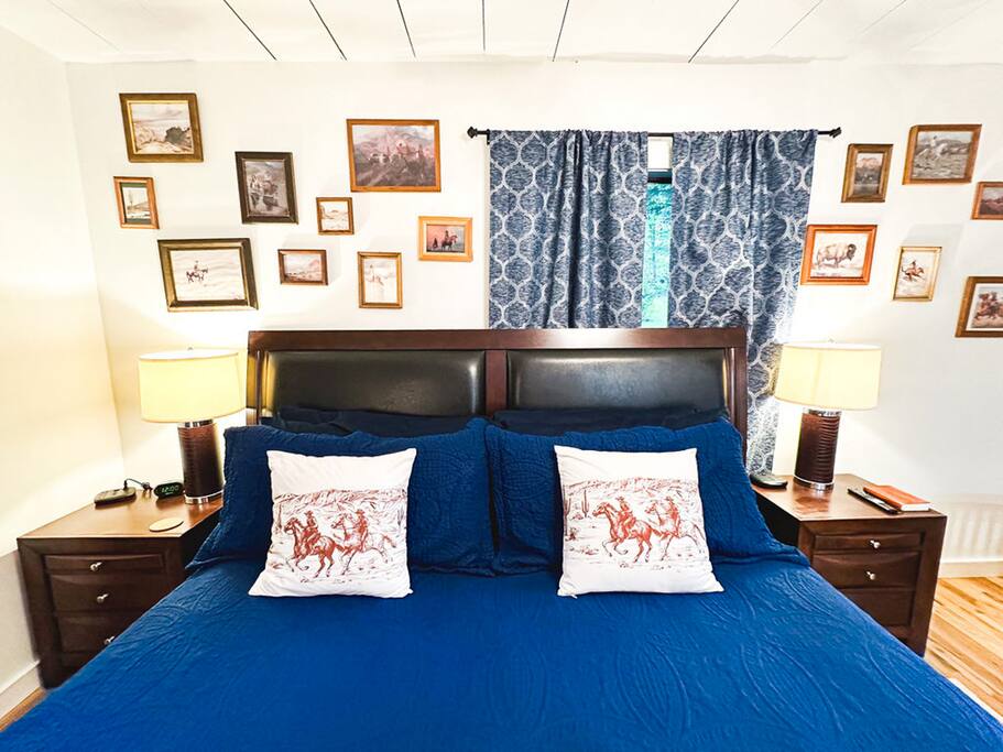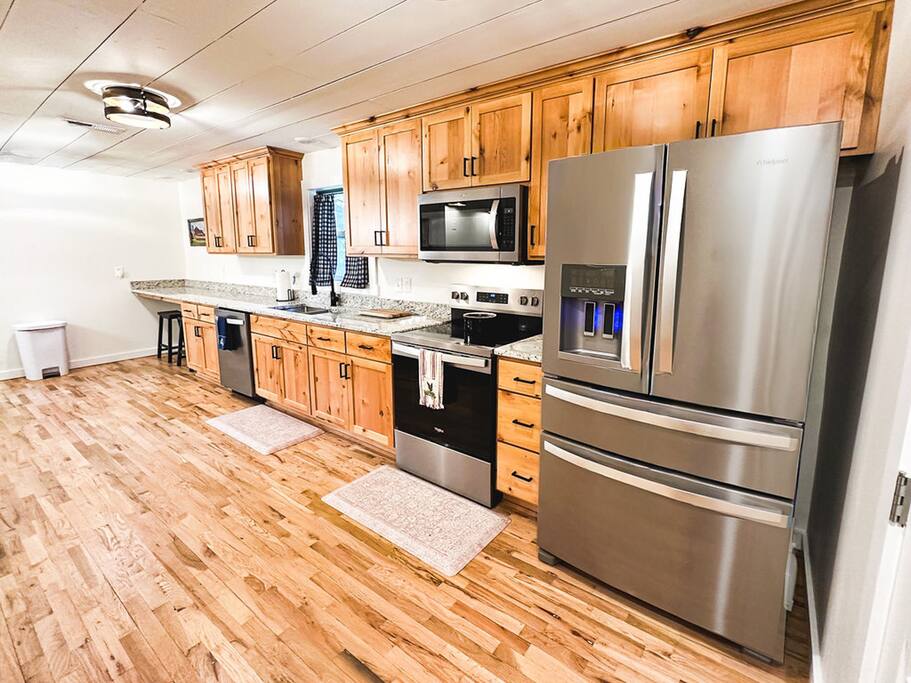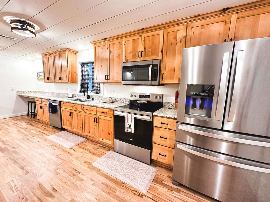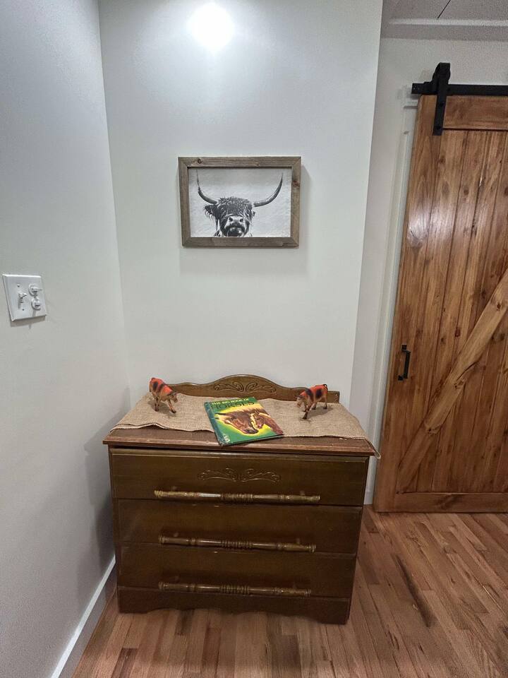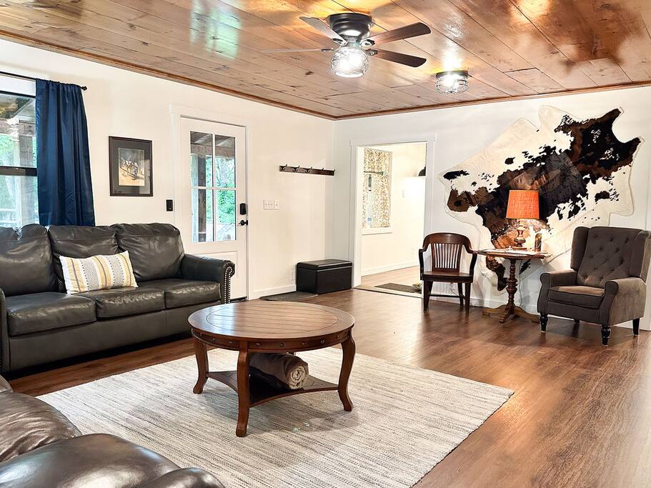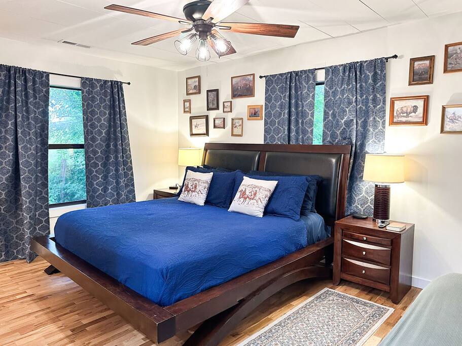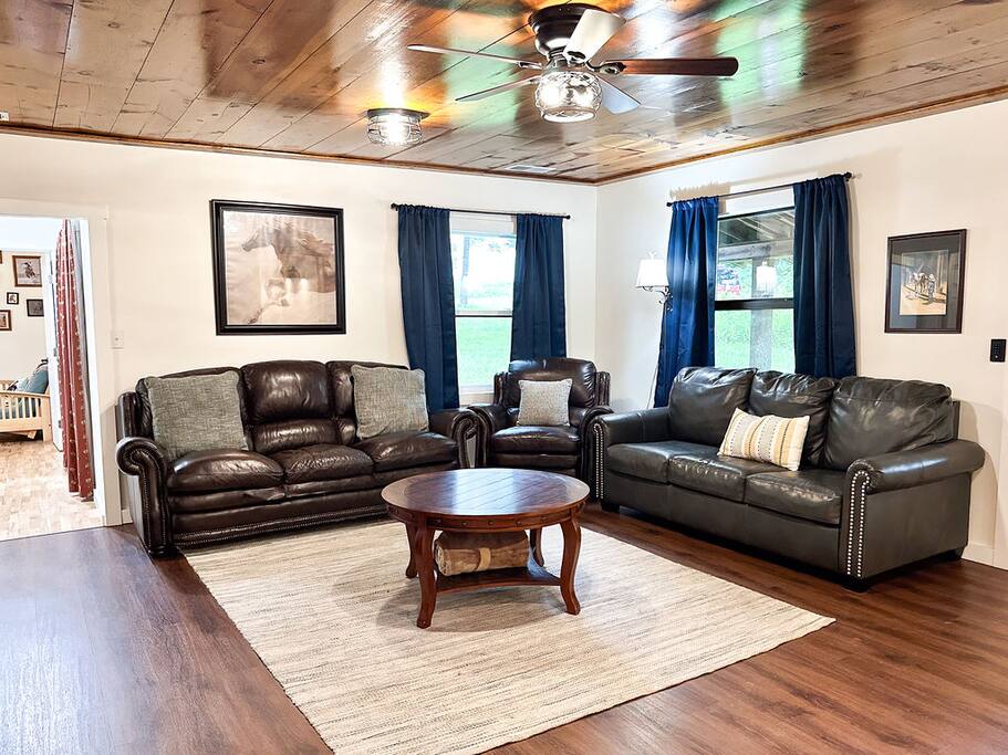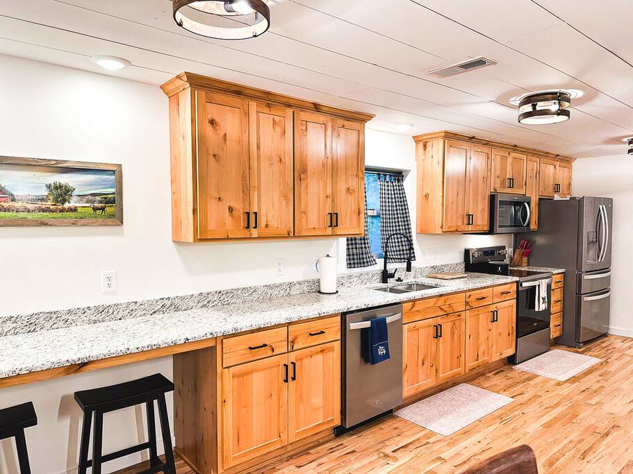 This well-appointed, fully renovated western home has all the charm of a country cowboy bunk house and all the comfort of a luxury stay. You will love the convenience of the large bedrooms, 3 full bathrooms, wide doorways, and the majority of the home being on one level ( the kitchen is two steps down.) There is plenty of seating in the spscious living room for y'all to gather for conversation. In this house, every seat is a prime location for watching the large screen smart TV. The game hall is perfect for a rousing board game or to find a quiet chair to read a book. Cooking up delicious meals is a joy in the bright and airy kitchen that has every thing you need and a few extras. This kitchenn is very well stocked to cook all your meals at the house. The shaded grassy lawns bordered by rustic old wooden barns makes the outdoor space as attractive as the lovely inside. Enjoy a meal out on the picnic table or around the fire pit that is outfitted with a grill top.. There is plenty of parking for multiple vehicles along the circular drive way and in front of the barns. Welcome SMOOR (Southern Missouri Off Road Ranch) visitors!