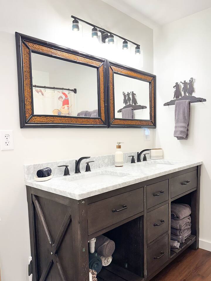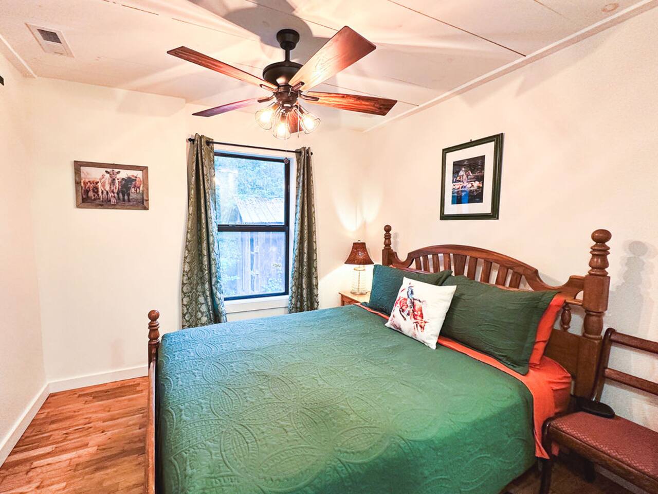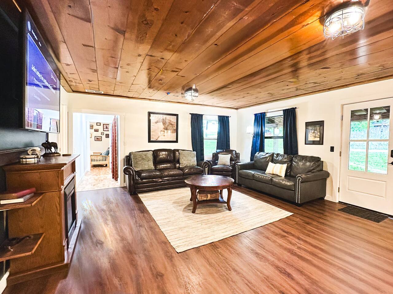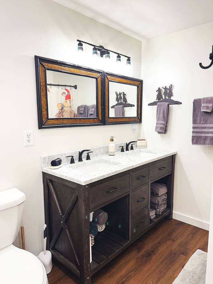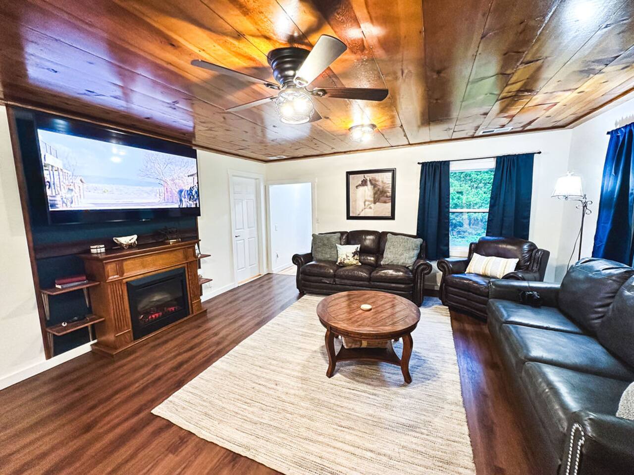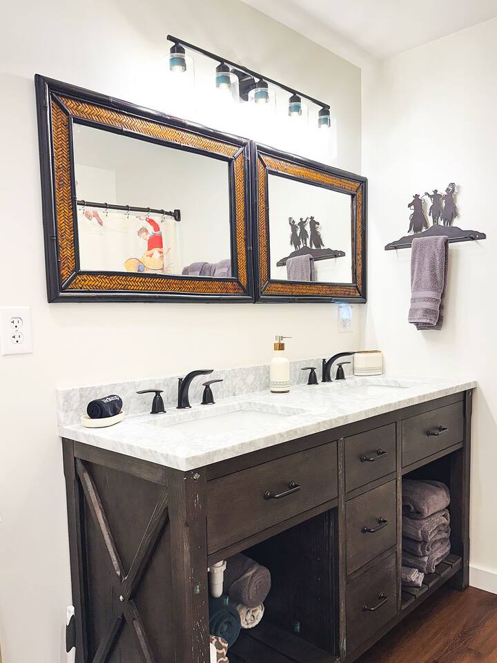 This well-appointed, fully renovated western home has all the charm of a country cowboy bunk house and all the comfort of a luxury stay. You will love the convenience of the large bedrooms, 3 full bathrooms, wide doorways, and the majority of the home being on one level ( the kitchen is two steps down.) There is plenty of seating in the spscious living room for y'all to gather for conversation. In this house, every seat is a prime location for watching the large screen smart TV. The game hall is perfect for a rousing board game or to find a quiet chair to read a book. Cooking up delicious meals is a joy in the bright and airy kitchen that has every thing you need and a few extras. This kitchenn is very well stocked to cook all your meals at the house. The shaded grassy lawns bordered by rustic old wooden barns makes the outdoor space as attractive as the lovely inside. Enjoy a meal out on the picnic table or around the fire pit that is outfitted with a grill top.. There is plenty of parking for multiple vehicles along the circular drive way and in front of the barns. Welcome SMOOR (Southern Missouri Off Road Ranch) visitors!