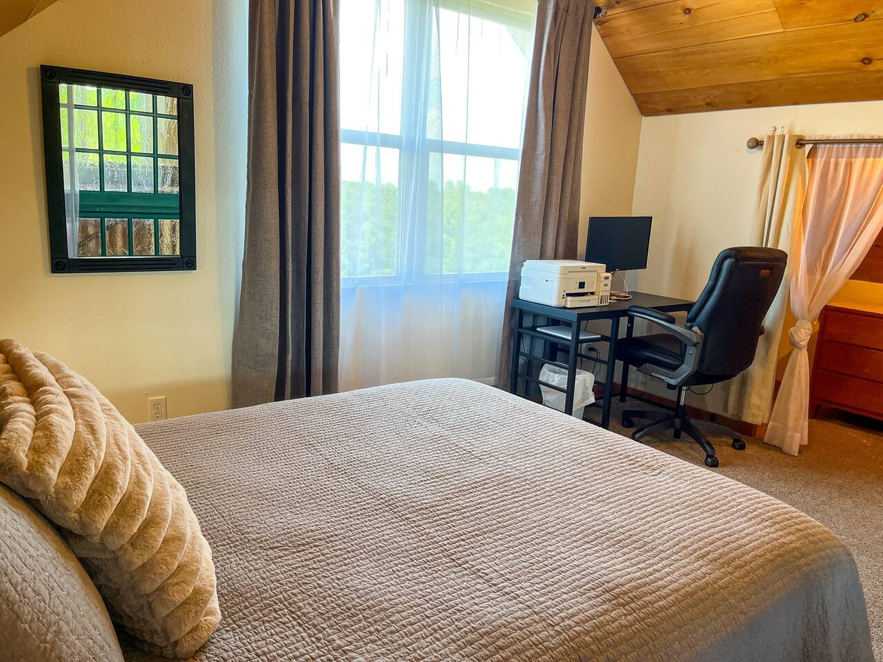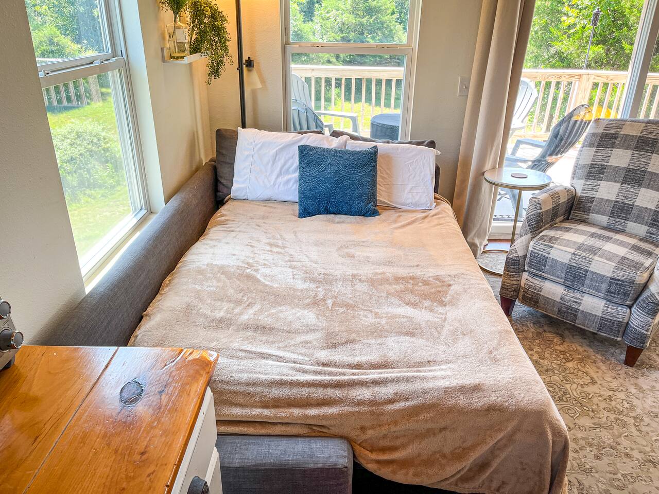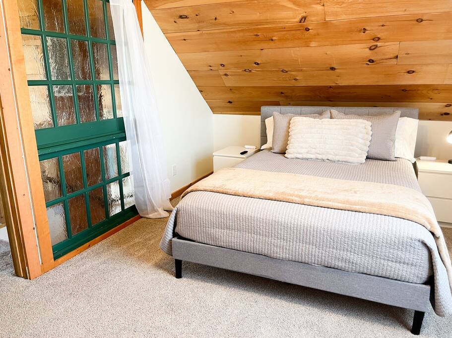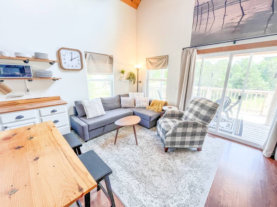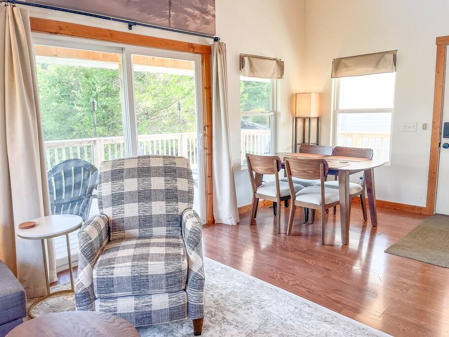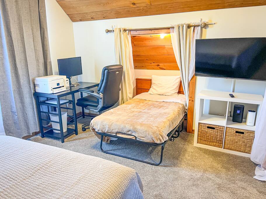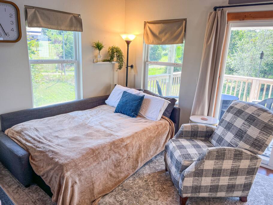 Step inside and feel instantly at home. Though it offers 1,300 sq. ft. of space, the home’s tiny house footprint makes every corner feel cozy and inviting. The main floor opens from the deck into a bright, airy living space where a soaring ceiling and large upper window fill the room with natural light. The open layout connects the living room, dining area, and fully stocked kitchen for easy conversation and connection. A bedroom and bathroom are also on this level for convenience. Upstairs, the second bedroom features a full glass door to let in as much light as you wish—or pull the curtain for cozy privacy. A quiet desk area with printer and monitor is ready for work or study, and a reading nook on the landing invites you to curl up with a good book. The walkout basement is designed for unwinding: a massive, ultra-comfortable couch faces a large-screen TV for movie nights, and a dartboard offers a playful challenge. This level also includes a bathroom and laundry room for your comfort. Set on 5 wooded acres, the backyard overlooks a serene natural valley where deer often wander through in the mornings and evenings. Please note, the valley includes a natural drainage area that may carry flowing water during heavy rain. This area is not fenced, so guests should supervise children and pets carefully. Sleeping: 1) Queen Bed in the main floor bedroom 2) Queen Bed in the upstairs bedroom. 3) Single Bed in the upstairs bedroom: This is an XL Adult folding cot that is the size and comfort of a Twin bed. It usually lives in the upstairs bedroom closet for you to set-up should you need additional sleeping space. Linens are in the same closet. This is not your average cot! 4) Sofa Bed: the main floor couch pulls open to a sofa bed. The ‘L’ section of the sofa lifts up to reveal a comfortable foam mattress topper that has a waterproof protector and a padded mattress cover. There are linens and pillows in the main floor bedroom closet Mobility Questions: Though our home spans three stories, all essential living spaces are conveniently located on the main floor for guests with mobility needs. After a few steps up from the gravel driveway onto the deck, you’ll find the kitchen, dining area, living room with a sleeper sofa, queen bedroom, and full bathroom—all on one level. The main-floor bathroom features a bathtub with shower, while the basement bathroom offers a shower only.