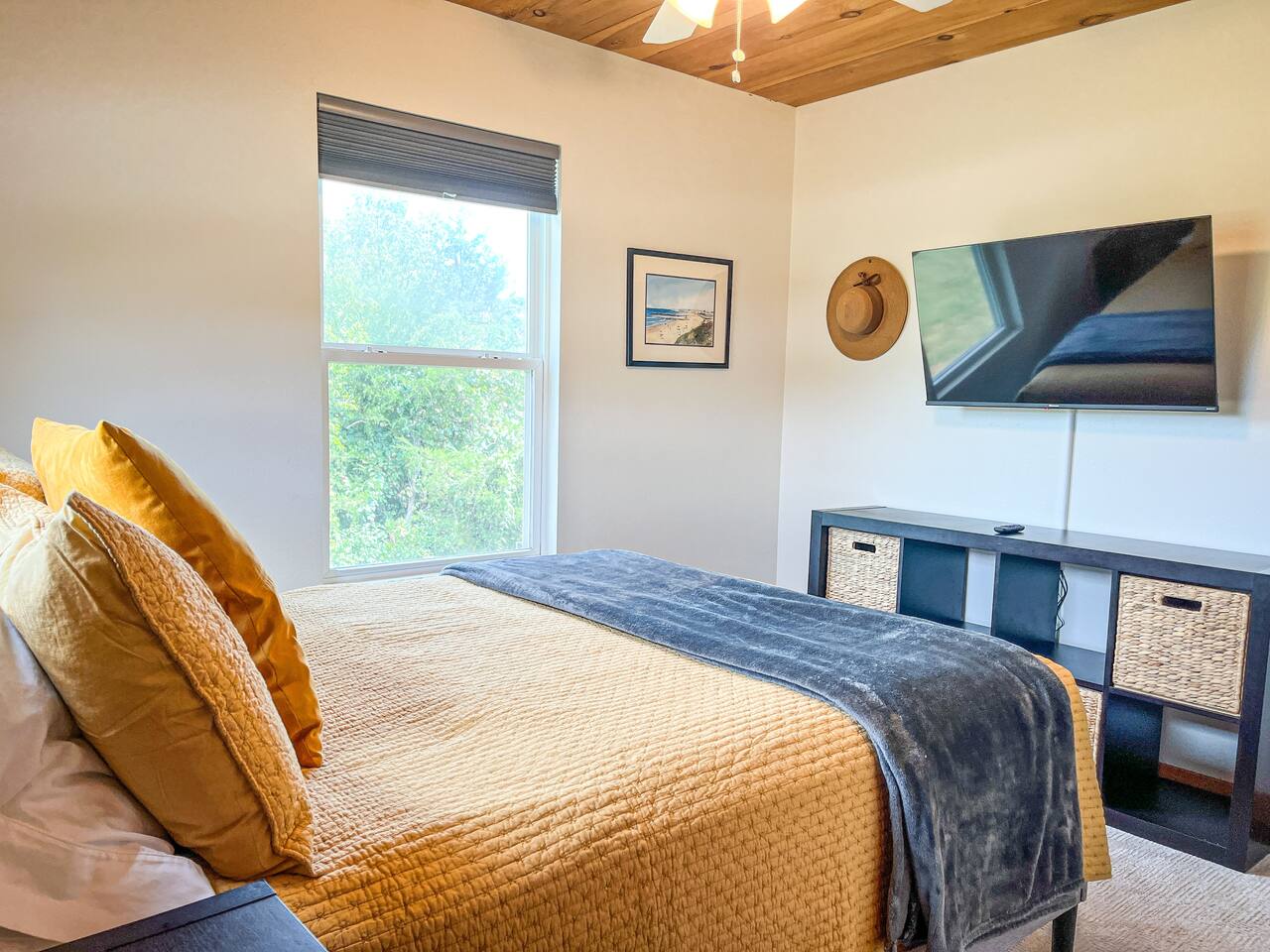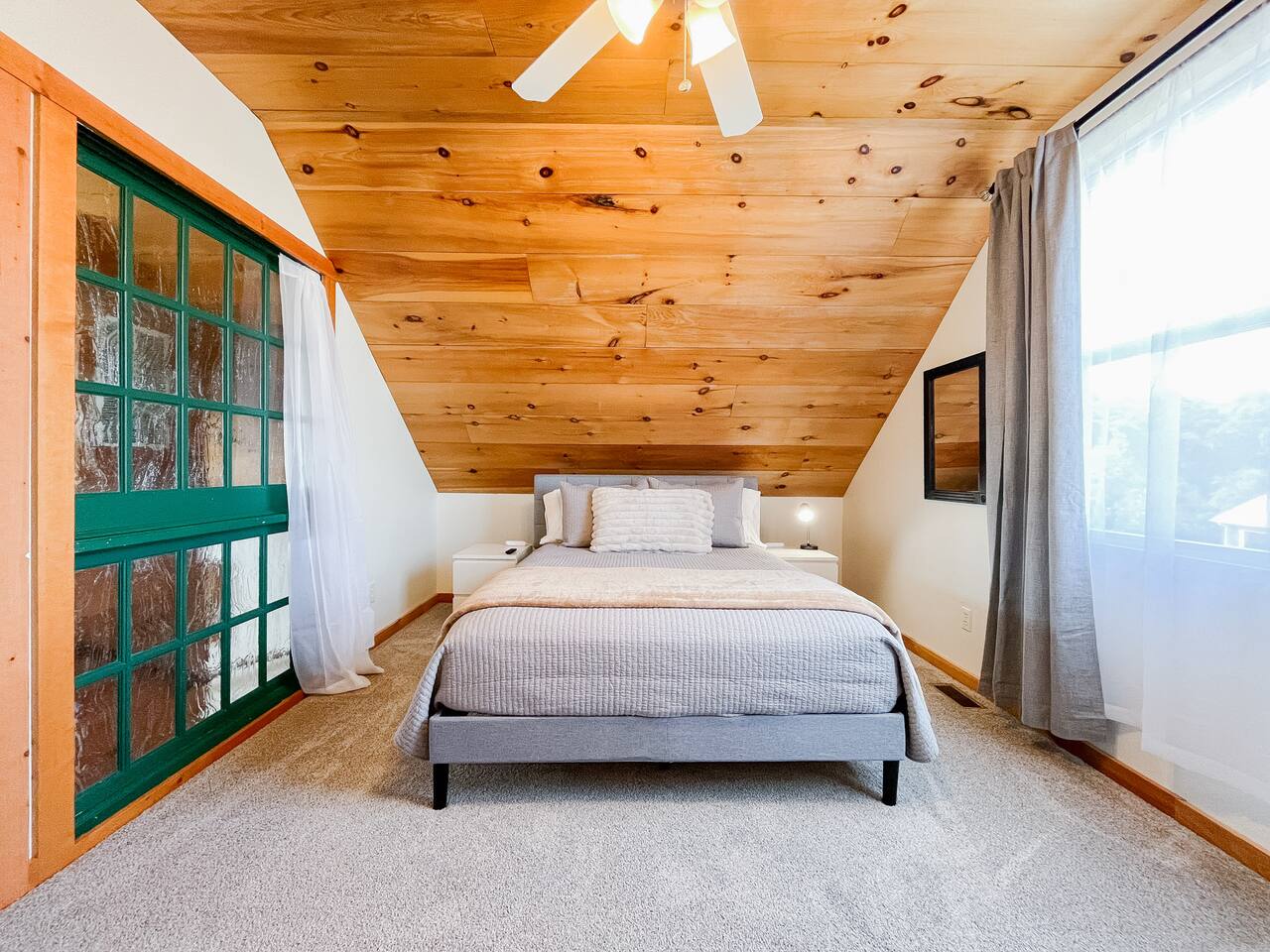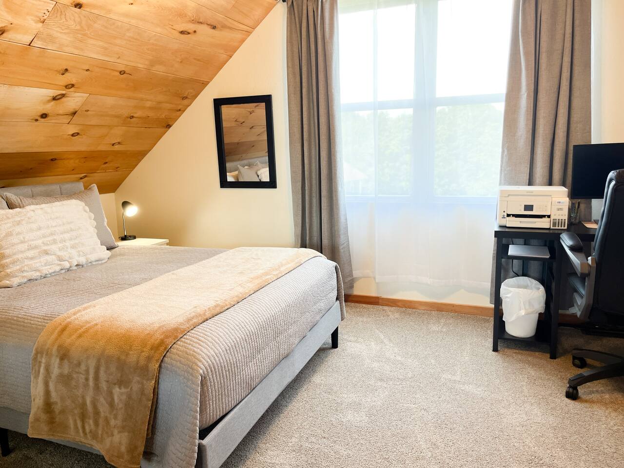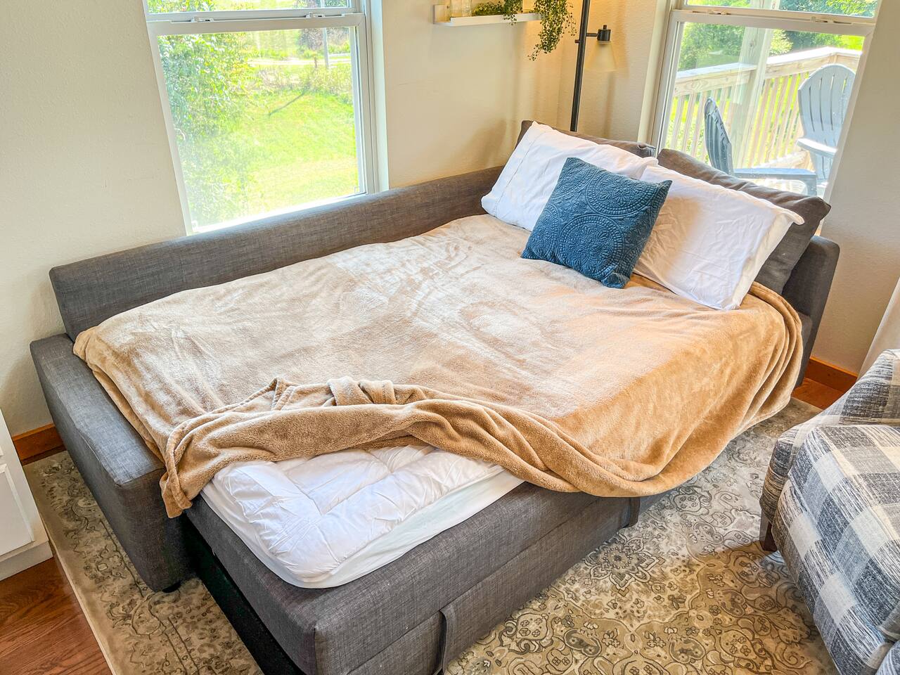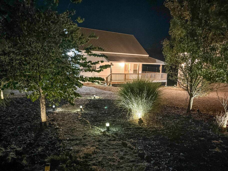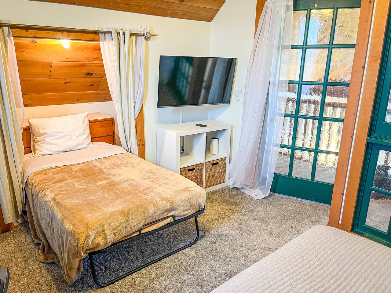 Step inside and feel instantly at home. Though it offers 1,300 sq. ft. of space, the home’s tiny house footprint makes every corner feel cozy and inviting. The main floor opens from the deck into a bright, airy living space where a soaring ceiling and large upper window fill the room with natural light. The open layout connects the living room, dining area, and fully stocked kitchen for easy conversation and connection. A bedroom and bathroom are also on this level for convenience. Upstairs, the second bedroom features a full glass door to let in as much light as you wish—or pull the curtain for cozy privacy. A quiet desk area with printer and monitor is ready for work or study, and a reading nook on the landing invites you to curl up with a good book. The walkout basement is designed for unwinding: a massive, ultra-comfortable couch faces a large-screen TV for movie nights, and a dartboard offers a playful challenge. This level also includes a bathroom and laundry room for your comfort. Set on 5 wooded acres, the backyard overlooks a serene natural valley where deer often wander through in the mornings and evenings. Please note, the valley includes a natural drainage area that may carry flowing water during heavy rain. This area is not fenced, so guests should supervise children and pets carefully. Sleeping: 1) Queen Bed in the main floor bedroom 2) Queen Bed in the upstairs bedroom. 3) Single Bed in the upstairs bedroom: This is an XL Adult folding cot that is the size and comfort of a Twin bed. It usually lives in the upstairs bedroom closet for you to set-up should you need additional sleeping space. Linens are in the same closet. This is not your average cot! 4) Sofa Bed: the main floor couch pulls open to a sofa bed. The ‘L’ section of the sofa lifts up to reveal a comfortable foam mattress topper that has a waterproof protector and a padded mattress cover. There are linens and pillows in the main floor bedroom closet Mobility Questions: Though our home spans three stories, all essential living spaces are conveniently located on the main floor for guests with mobility needs. After a few steps up from the gravel driveway onto the deck, you’ll find the kitchen, dining area, living room with a sleeper sofa, queen bedroom, and full bathroom—all on one level. The main-floor bathroom features a bathtub with shower, while the basement bathroom offers a shower only.
