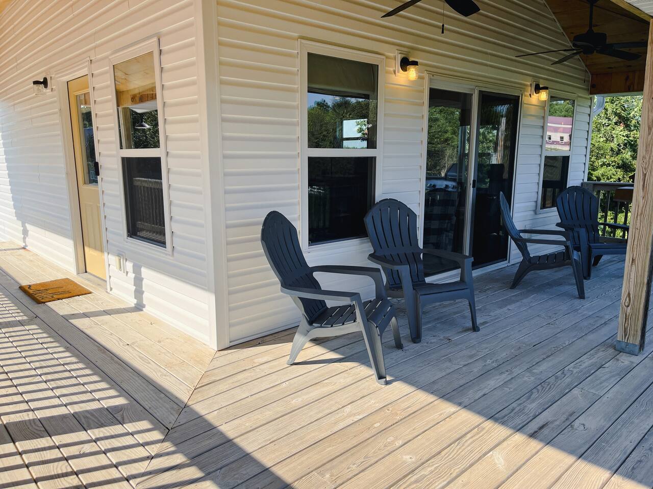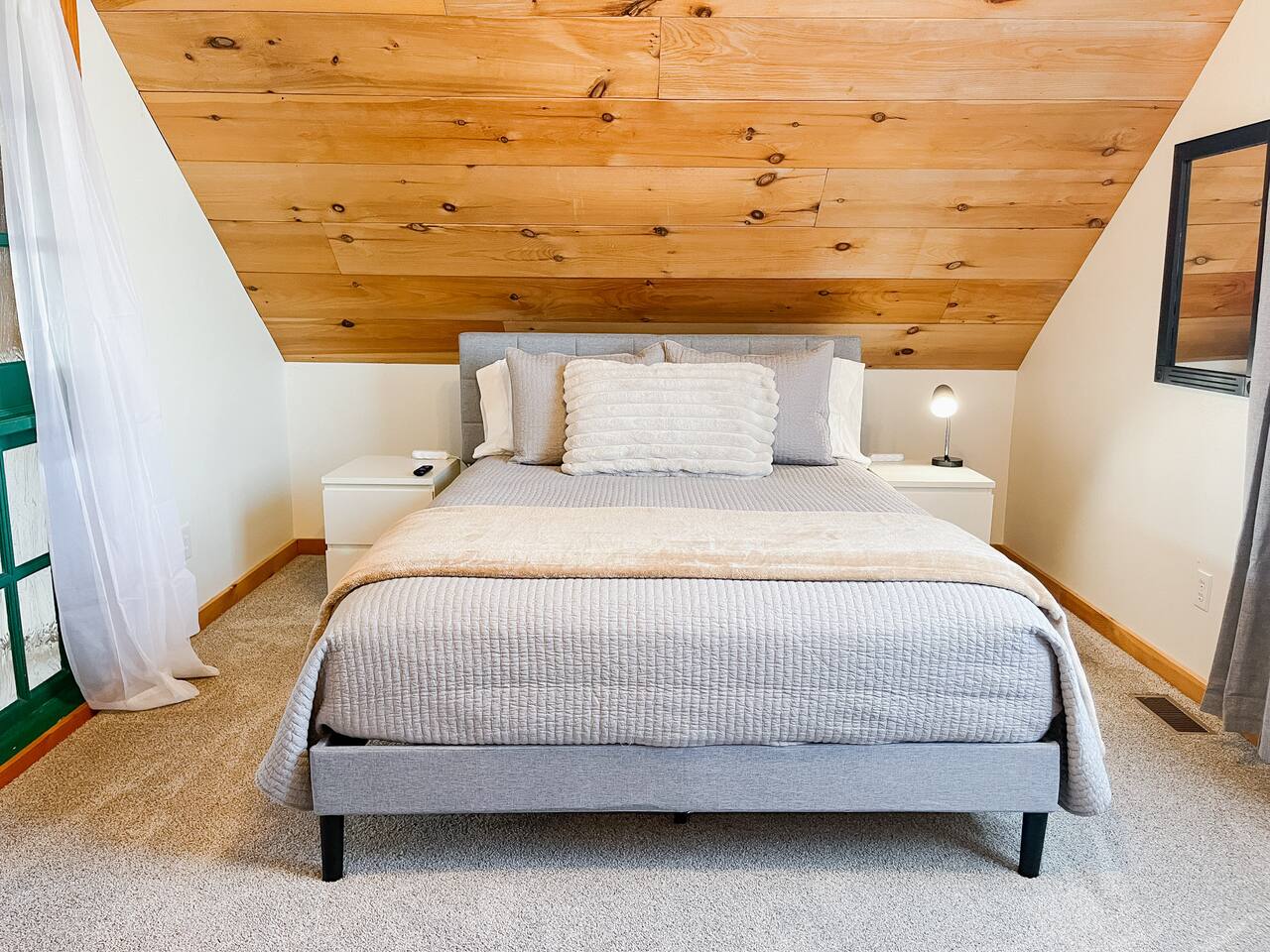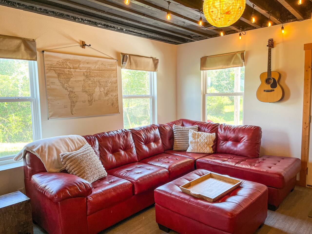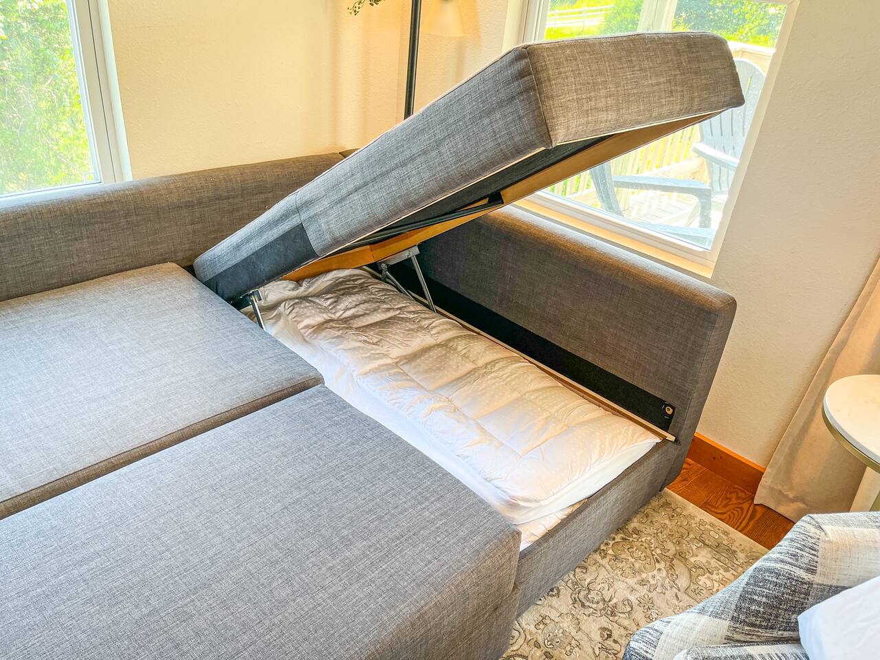 Step inside and feel instantly at home. Though it offers 1,300 sq. ft. of space, the home’s tiny house footprint makes every corner feel cozy and inviting. The main floor opens from the deck into a bright, airy living space where a soaring ceiling and large upper window fill the room with natural light. The open layout connects the living room, dining area, and fully stocked kitchen for easy conversation and connection. A bedroom and bathroom are also on this level for convenience. Upstairs, the second bedroom features a full glass door to let in as much light as you wish—or pull the curtain for cozy privacy. A quiet desk area with printer and monitor is ready for work or study, and a reading nook on the landing invites you to curl up with a good book. The walkout basement is designed for unwinding: a massive, ultra-comfortable couch faces a large-screen TV for movie nights, and a dartboard offers a playful challenge. This level also includes a bathroom and laundry room for your comfort. Set on 5 wooded acres, the backyard overlooks a serene natural valley where deer often wander through in the mornings and evenings. Please note, the valley includes a natural drainage area that may carry flowing water during heavy rain. This area is not fenced, so guests should supervise children and pets carefully. Sleeping: 1) Queen Bed in the main floor bedroom 2) Queen Bed in the upstairs bedroom. 3) Single Bed in the upstairs bedroom: This is an XL Adult folding cot that is the size and comfort of a Twin bed. It usually lives in the upstairs bedroom closet for you to set-up should you need additional sleeping space. Linens are in the same closet. This is not your average cot! 4) Sofa Bed: the main floor couch pulls open to a sofa bed. The ‘L’ section of the sofa lifts up to reveal a comfortable foam mattress topper that has a waterproof protector and a padded mattress cover. There are linens and pillows in the main floor bedroom closet Mobility Questions: Though our home spans three stories, all essential living spaces are conveniently located on the main floor for guests with mobility needs. After a few steps up from the gravel driveway onto the deck, you’ll find the kitchen, dining area, living room with a sleeper sofa, queen bedroom, and full bathroom—all on one level. The main-floor bathroom features a bathtub with shower, while the basement bathroom offers a shower only.