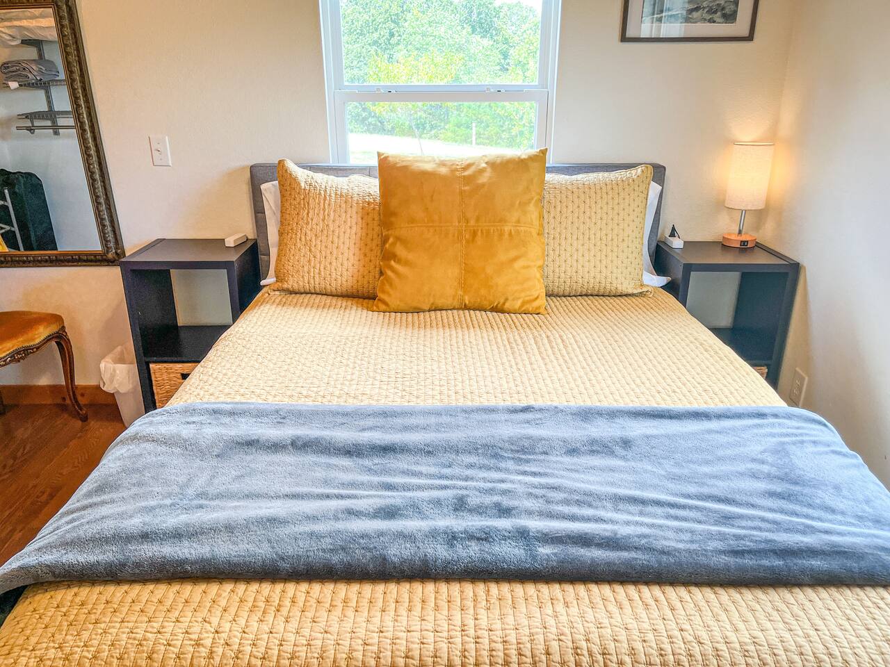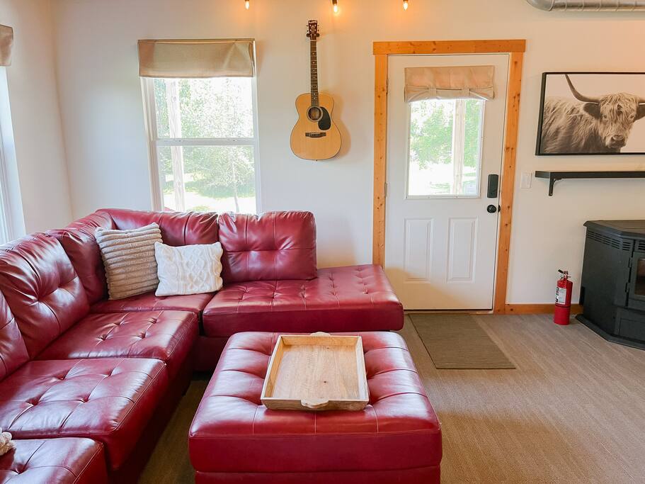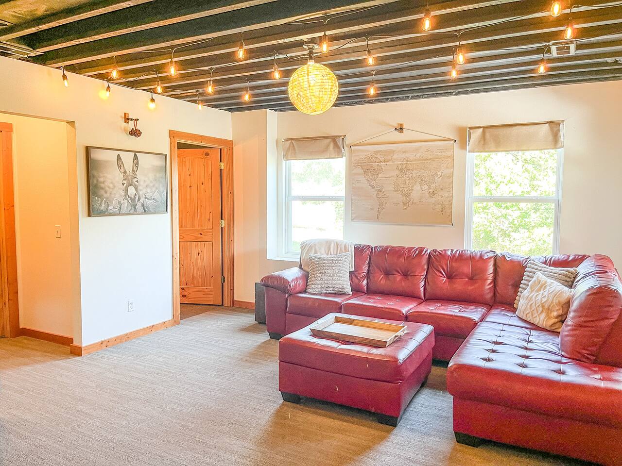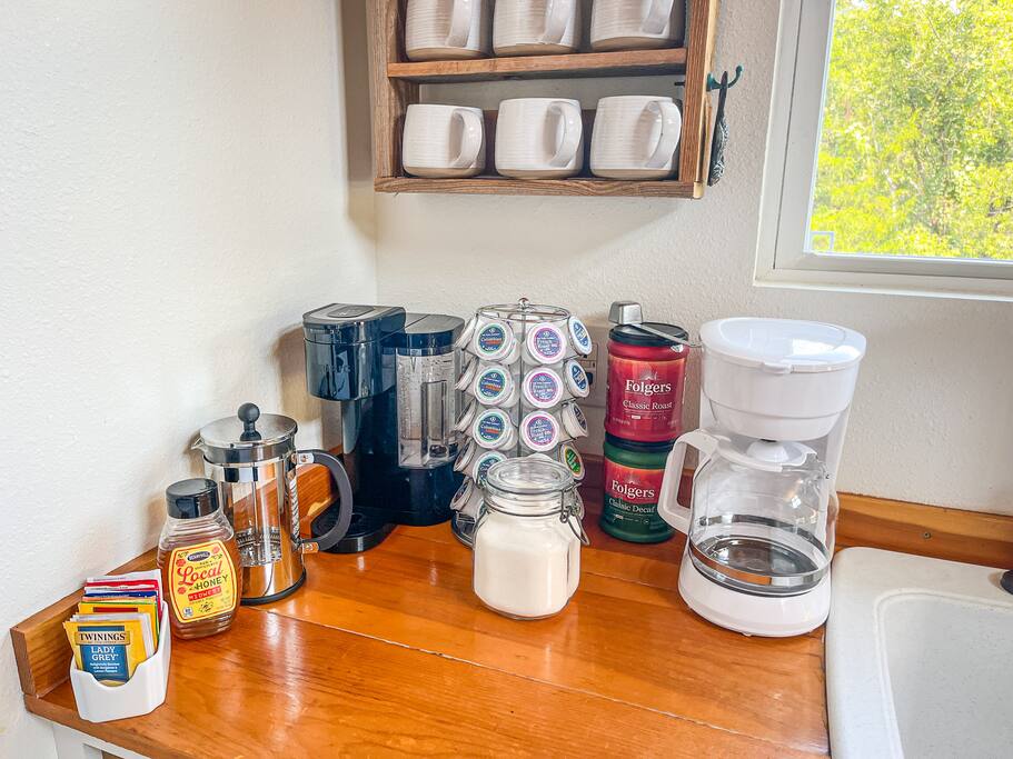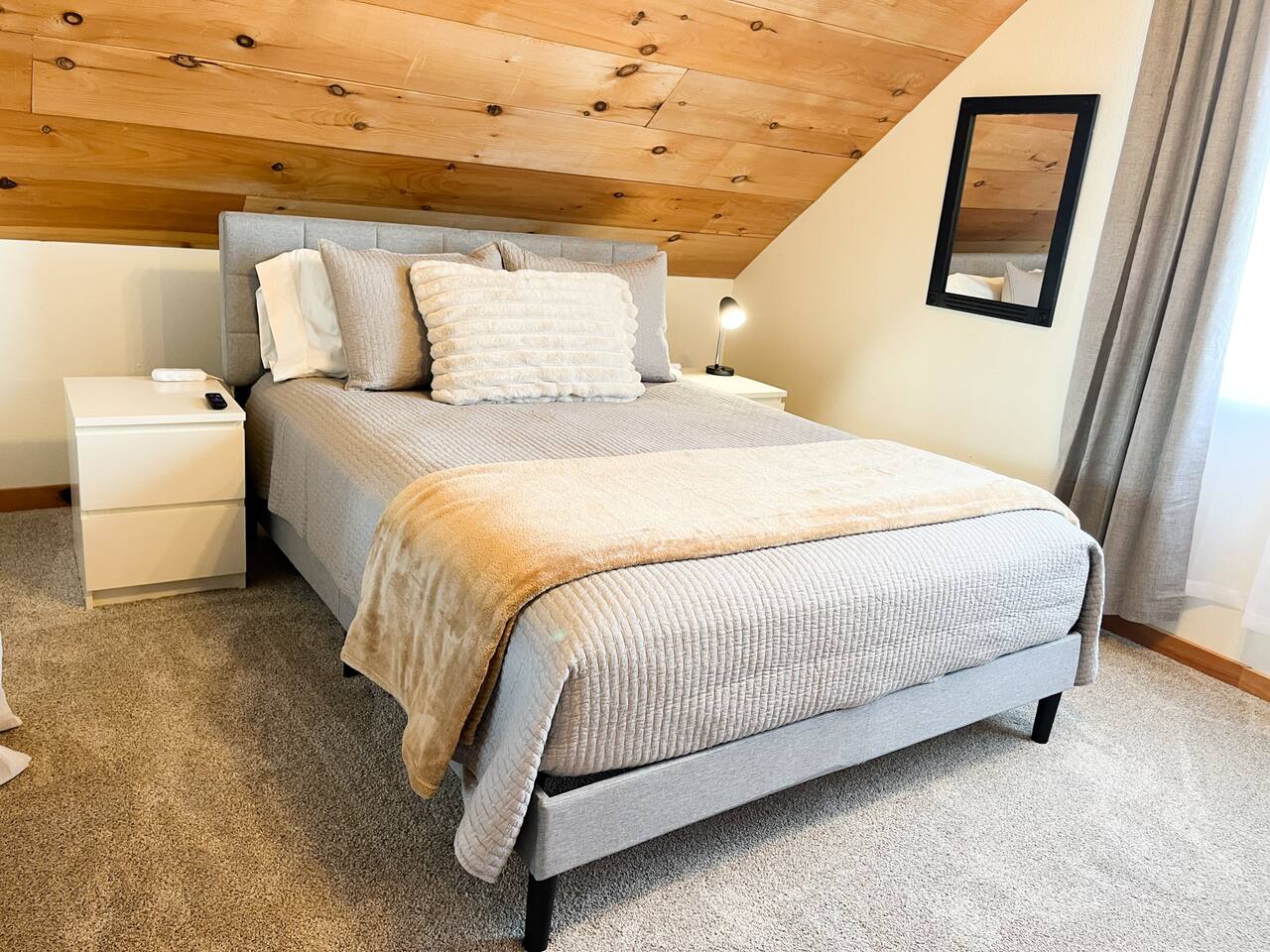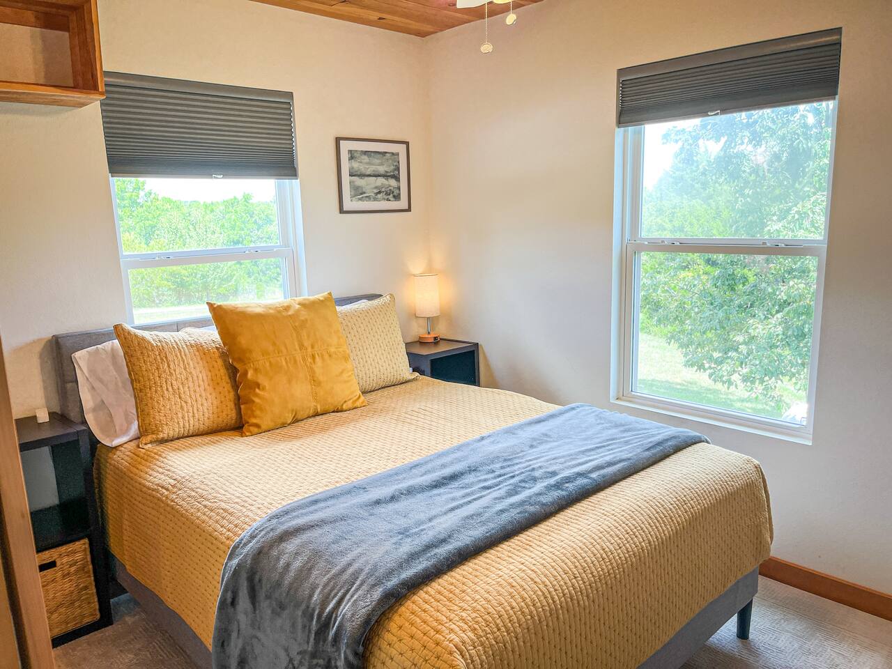 Step inside and feel instantly at home. Though it offers 1,300 sq. ft. of space, the home’s tiny house footprint makes every corner feel cozy and inviting. The main floor opens from the deck into a bright, airy living space where a soaring ceiling and large upper window fill the room with natural light. The open layout connects the living room, dining area, and fully stocked kitchen for easy conversation and connection. A bedroom and bathroom are also on this level for convenience. Upstairs, the second bedroom features a full glass door to let in as much light as you wish—or pull the curtain for cozy privacy. A quiet desk area with printer and monitor is ready for work or study, and a reading nook on the landing invites you to curl up with a good book. The walkout basement is designed for unwinding: a massive, ultra-comfortable couch faces a large-screen TV for movie nights, and a dartboard offers a playful challenge. This level also includes a bathroom and laundry room for your comfort. Set on 5 wooded acres, the backyard overlooks a serene natural valley where deer often wander through in the mornings and evenings. Please note, the valley includes a natural drainage area that may carry flowing water during heavy rain. This area is not fenced, so guests should supervise children and pets carefully. Sleeping: 1) Queen Bed in the main floor bedroom 2) Queen Bed in the upstairs bedroom. 3) Single Bed in the upstairs bedroom: This is an XL Adult folding cot that is the size and comfort of a Twin bed. It usually lives in the upstairs bedroom closet for you to set-up should you need additional sleeping space. Linens are in the same closet. This is not your average cot! 4) Sofa Bed: the main floor couch pulls open to a sofa bed. The ‘L’ section of the sofa lifts up to reveal a comfortable foam mattress topper that has a waterproof protector and a padded mattress cover. There are linens and pillows in the main floor bedroom closet Mobility Questions: Though our home spans three stories, all essential living spaces are conveniently located on the main floor for guests with mobility needs. After a few steps up from the gravel driveway onto the deck, you’ll find the kitchen, dining area, living room with a sleeper sofa, queen bedroom, and full bathroom—all on one level. The main-floor bathroom features a bathtub with shower, while the basement bathroom offers a shower only.
