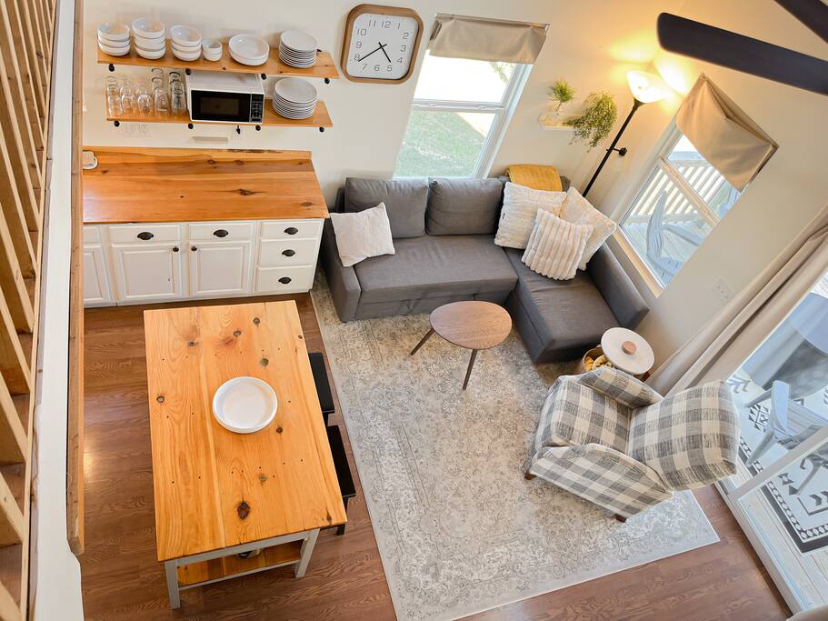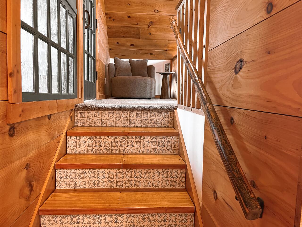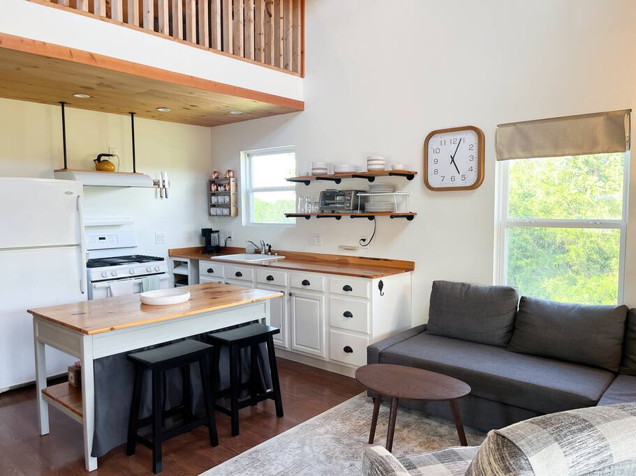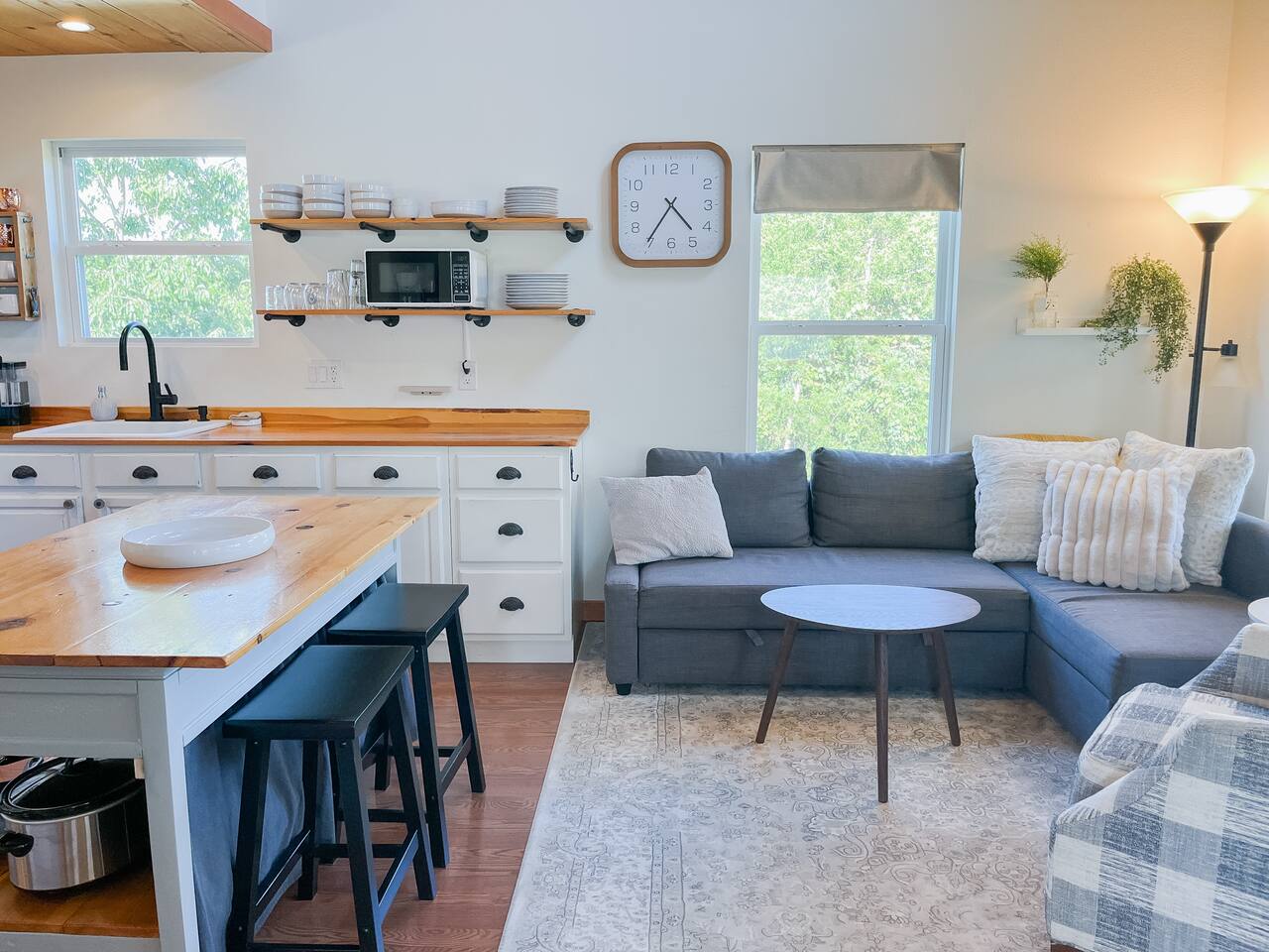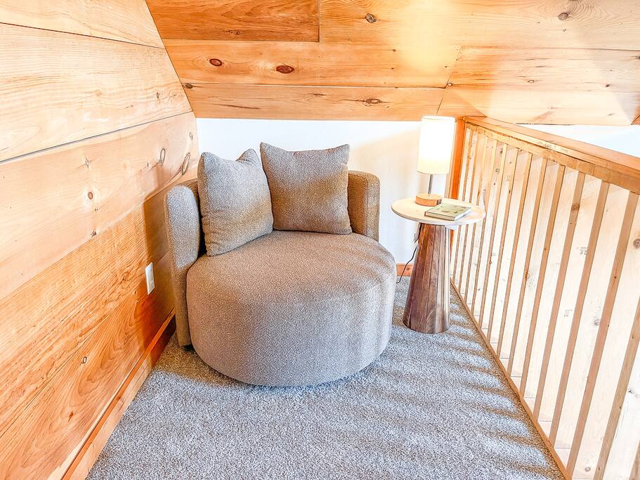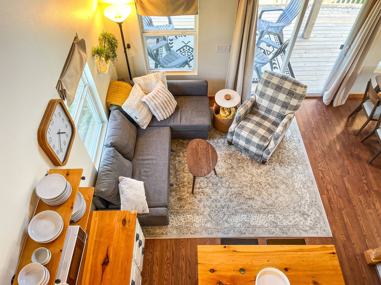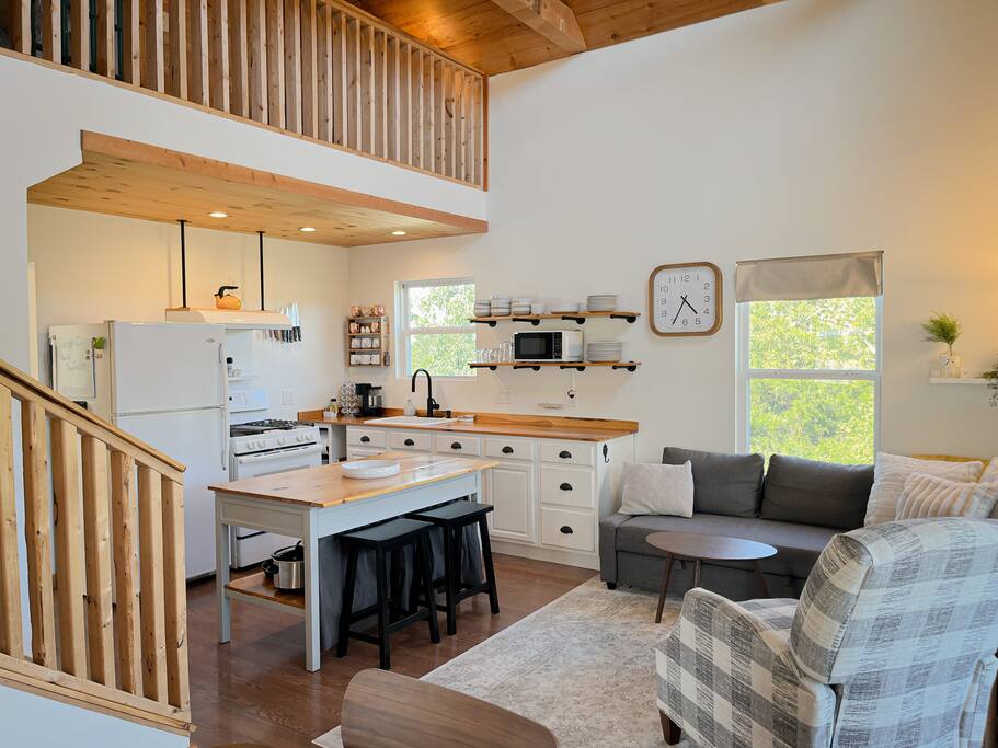 Scandinavian-style 3-story tiny house filled with natural light, warm wood accents, and a cozy, modern vibe set on 3.5acr. Enjoy a well-stocked kitchen, private deck with grill—perfect for watching deer wander by in the mornings and evenings—and a comfy movie nook with a leather sofa. High-end bedding, TVs in every bedroom, desk with printer for working on the go, darts, board games and peaceful forest views where deer often visit complete this unique, elevated tiny home nestled among the trees.