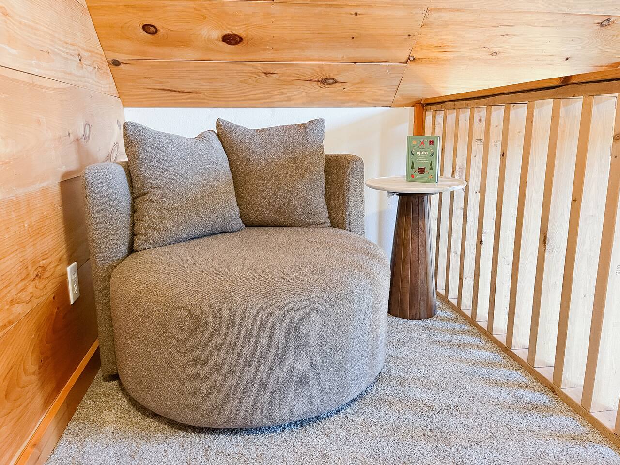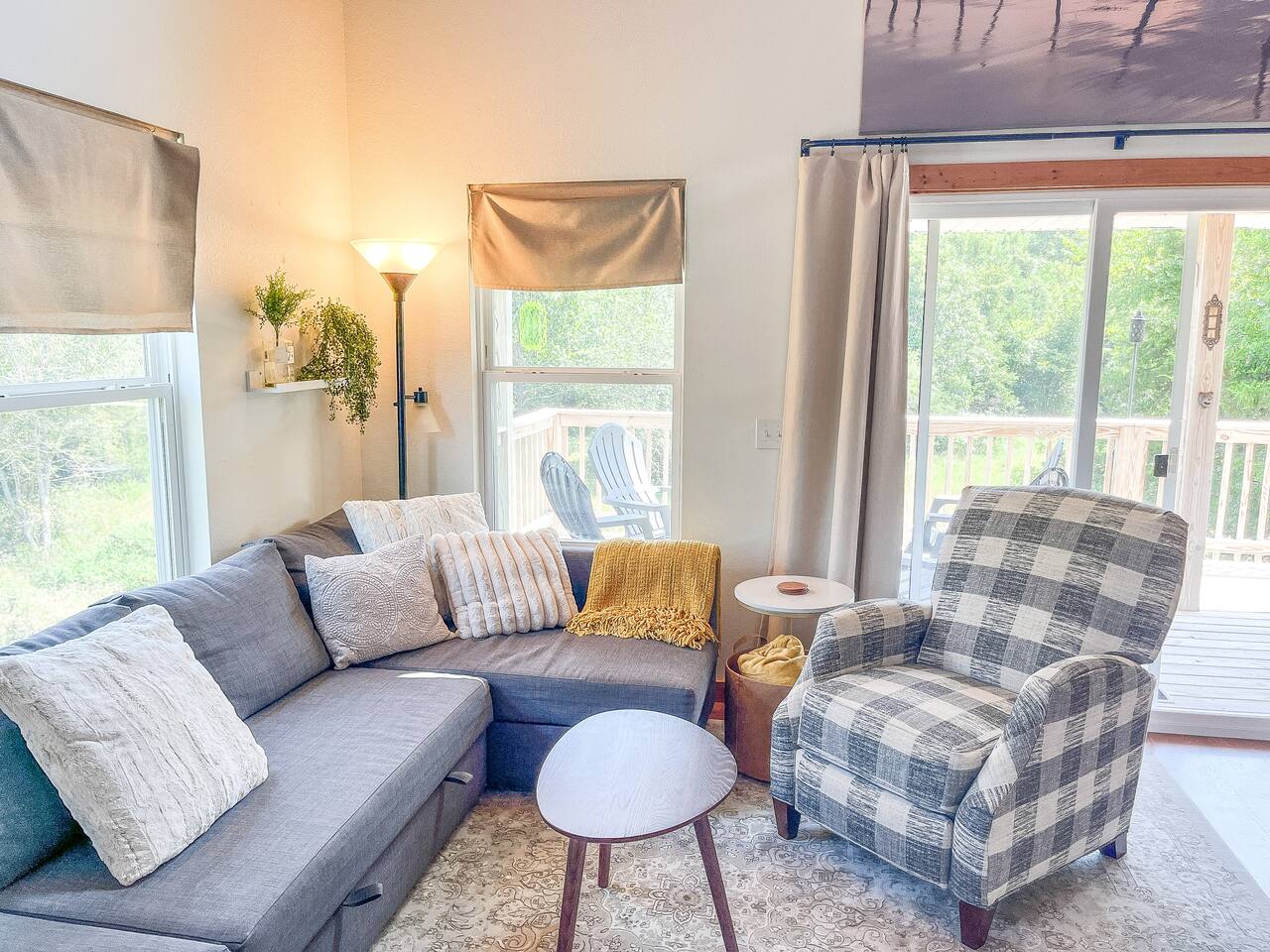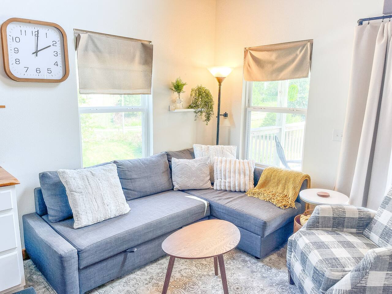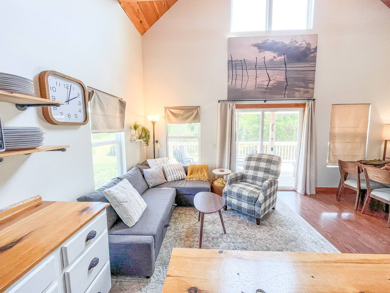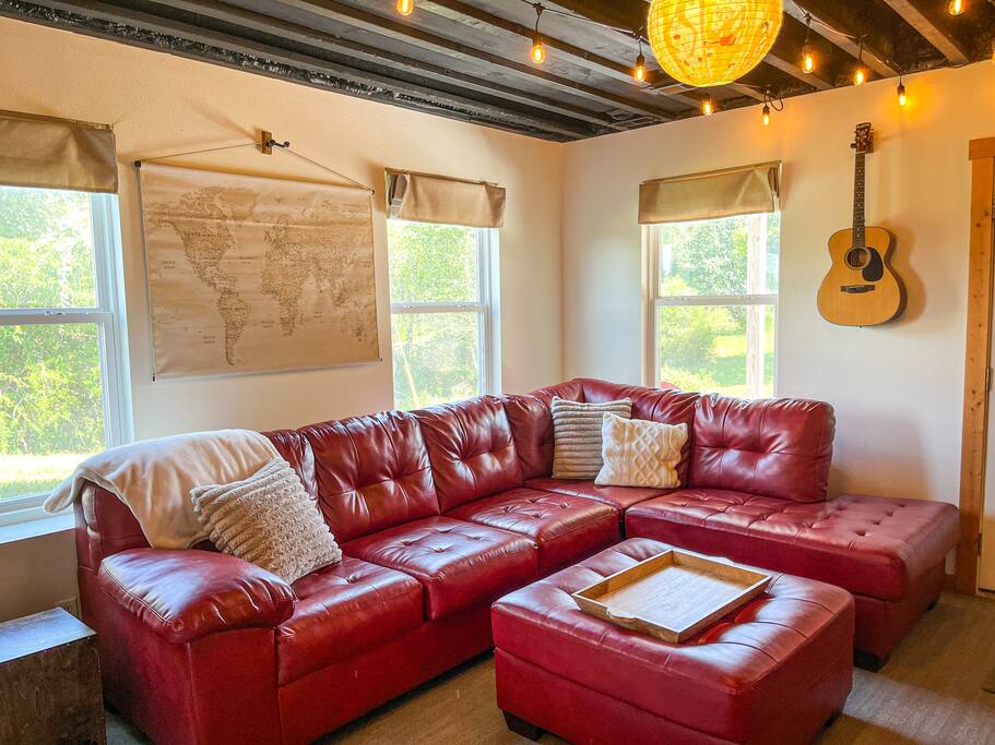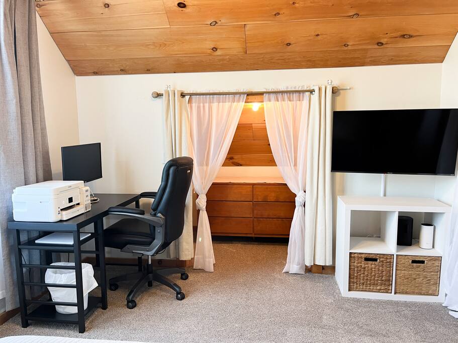 Scandinavian-style 3-story tiny house filled with natural light, warm wood accents, and a cozy, modern vibe set on 3.5acr. Enjoy a well-stocked kitchen, private deck with grill—perfect for watching deer wander by in the mornings and evenings—and a comfy movie nook with a leather sofa. High-end bedding, TVs in every bedroom, desk with printer for working on the go, darts, board games and peaceful forest views where deer often visit complete this unique, elevated tiny home nestled among the trees.